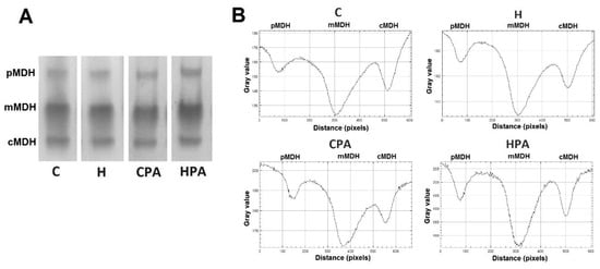 Representative zymograms of malate dehydrogenase isoforms (A) and representative densitometric curves malate dehydrogenase isoforms (B) in rat cardiac tissue. C—0.9% NaCl; H—homocysteine; CPA—0.9% NaCl + physical activity on treadmill; HPA—homocysteine + physical activity on treadmill. cMDH—cytosolic malate dehydrogenase, mMDH—mitochondrial malate dehydrogenase, pMDH—peroxisomal malate dehydrogenase.