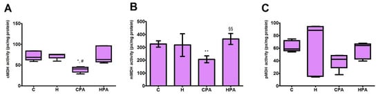 Relative activities of different isoforms of malate dehydrogenase in rat cardiac tissue—densitometric analysis. C—0.9% NaCl; H—homocysteine; CPA—0.9% NaCl + physical activity on treadmill; HPA—homocysteine + physical activity on treadmill. cMDH—cytosolic malate dehydrogenase, mMDH—mitochondrial malate dehydrogenase, pMDH—peroxisomal malate dehydrogenase. (A,C): Kruskal–Wallis with Dunn–Bonferoni post hoc test: * p < 0.05 versus C, # p < 0.05 versus H. (B): Welch’s ANOVA with Games–Howell post hoc test: ** p < 0.01 versus C: §§ p < 0.01 versus CPA.