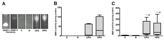 In SDS–PAGE zymography, in rat heart tissue homogenates in the C and H group only MMP-9 isoform was detected, while in the CPA and HPA groups, both MMP-2 and MMP-9 isoforms manifested their activities on gel slab (Figure 7A). There was no significant difference in MMP-2 activity between the CPA and HPA group (Figure 7B). MMP-9 activity was very low in passive groups C and H in comparison to active groups CPA and HPA. MMP-9 activity in the CPA group (40.2 (28.7–260.7) px/mg protein) was significantly elevated compared to the C group (6.3 (3.5–10.8) px/mg protein, p < 0.01) and H group (5.4 (3.7–8.9) px/mg protein, p < 0.01), likewise, MMP-9 activity in the HPA group (62.2 (23.5–228.9) px/mg protein) in comparison to the C (p < 0.01) and H group (p < 0.01) (Figure 7C).