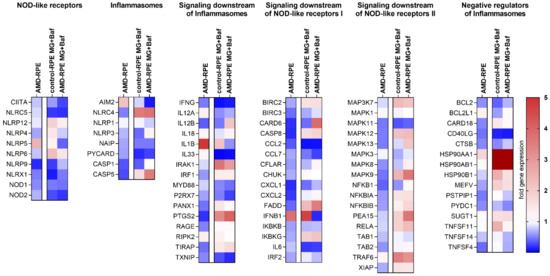Expression levels of inflammasome-related genes determined by PCR Array. For each treatment group RNA from five samples extracted in three independent experiments was combined for analysis on a 96-well PCR array and data are presented as heatmaps. Data were analyzed using the 2−ΔΔcT method, normalized to the housekeeping gene B2M and compared to the relevant control (i.e., vehicle-treated control-RPE for vehicle-treated AMD-RPE and MG + Baf-treated control-RPE, and vehicle-treated AMD-RPE for MG + Baf-treated AMD-RPE). MG, MG-132; Baf, bafilomycin A1.