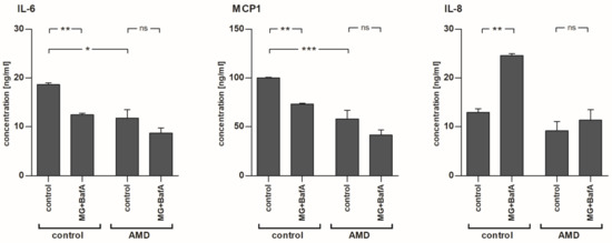 The levels of IL-6, MCP-1, and IL-8 in IL-1α-primed iPSC-derived RPE cells from a healthy control and an AMD patient with or without exposure to 5 µM MG-132 and 50 nM bafilomycin A1. The data have been combined from three independent experiments with 2–6 parallel samples per group and are presented as mean +/− SEM. Ns, not statistically significant; *, p < 0.05; **, p < 0.01; ***, p < 0.001; Mann–Whitney U-test.