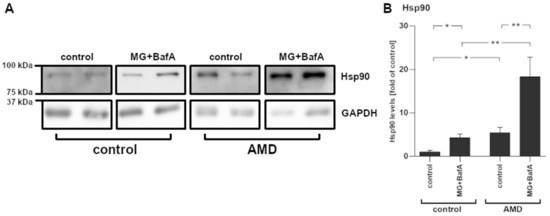 The analysis of protein samples from cultured iPSC-derived RPE cells confirmed the presence of increased levels of Hsp90 after the exposure to MG-132 and bafilomycin A1 (Figure 5). Additionally, Hsp90 levels were significantly and more than 5-fold higher in AMD-RPE cells when compared to control-RPE cells. Similarly to the results observed in IL-1β, IL-6, and MCP-1, vehicle-treated AMD-RPE cells showed a protein expression pattern resembling that of control-RPE cells exposed to MG-132 and bafilomycin A1.
