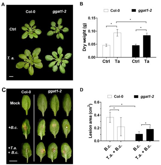 3.5. GGAT1 Is Partially Required for Plant Growth Stimulation by T. atroviride