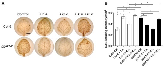 2.7. In Arabidopsis, GGAT1 Participates in the Resistance against B. cinerea, Tentatively through a Mechanism Involving H2O2 Production