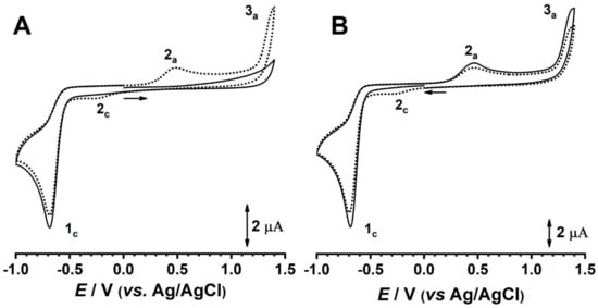 A new experiment was performed in similar conditions using a clean GC electrode surface but scanning toward negative potential values (Figure 1B). The cathodic peak 1c appeared at Epc = −0.62 V, and after changing the scan direction the two anodic charge transfer reactions, 2a and 3a, appeared at Epa = +0.45 V and Epa = +1.35 V, respectively. Additionally, on the second scan, the reduction peak 2c occurred at Epc = −0.25 V. By increasing the pH of the electrolyte (Figure 2), all redox potentials of AZA shifted linearly to less positive potentials, while ΔEp of the 2a/2c pair remained constant.
