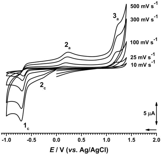 Cyclic voltammetry (CV) was performed for scan rates ranging from 10 to 500 mV s−1 with a 2 mV step potential from Estart = 0V, Emin = −1 V, and Emax = 1.4 V. Differential pulse (DP) voltammetry values were recorded with a pulse amplitude of 50 mV, pulse width of 100 ms, and scan rate of 5 mV s−1. All of the presented voltammograms were background-subtracted and baseline-corrected using the IVIUM soft program tools. This mathematical treatment reduces the peak heights by up to 10% and was used for the presentation of all experimental voltammograms to allow easier and clearer identification of the peaks. The values for peak currents presented in all graphs were determined from the original untreated voltammograms.