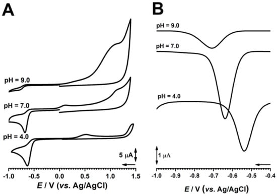 (A) CV at v = 100 mV s−1 and (B) DPV in 500 µM AZA in electrolytes with different pH values.