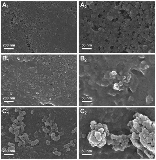 SEM images at (1) 50,000 and (2) 200,000 magnification: (A) electrode surface; the dsDNA biosensor (B) before and (C) after incubation in 500 µM AZA.