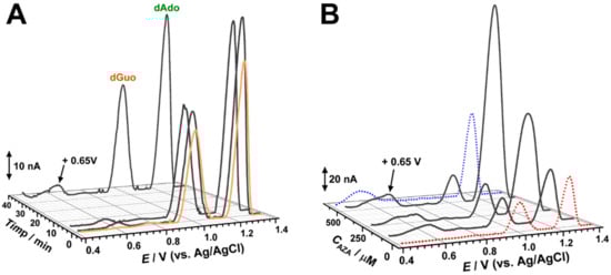 The next electrochemical experiments were performed and the dsDNA electrochemical biosensors was incubated at an applied potential of −0.60 V for 10 min in solutions of different concentrations of AZA (Figure 6B). In these conditions, both dGuo and dAdo oxidation peaks gradually increased with the AZA concentration, but a higher increase was observed for adenine residues. A similar effect was detected for the peak at +0.65 V.
