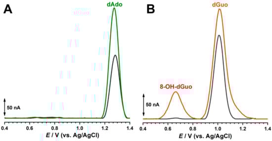 DP voltammograms in acetate buffer (0.1 M, pH 4.5) with different biosensors: (A) poly(A) and (B) poly(G) biosensors before (grey curves) and after incubation (green and orange curves, respectively) in 500 µM AZA over 10 min.