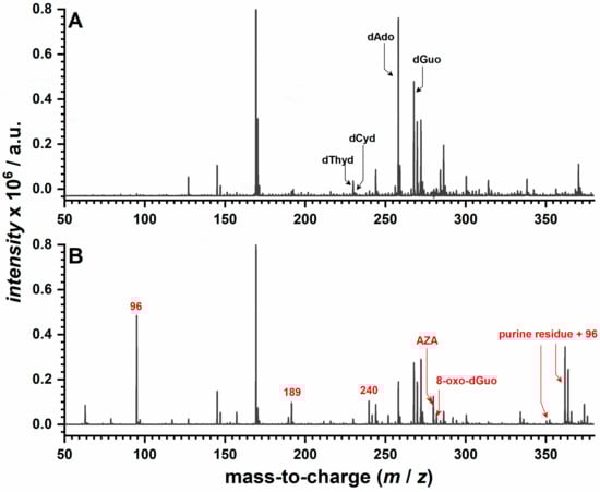 MS spectra for the acid-digested dsDNA: (A) before and (B) after incubation at −0.60 V in 500 µM AZA for 30 min.