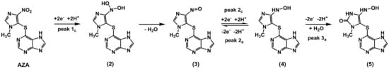 Although the 6-mercaptopurine undergoes redox reactions, none of the peaks observed for this compound were identified in the CV recorded for AZA. In fact, the voltammetric behavior of AZA was dominated by that of 1-metyl-4-nitro imidazole. It is proposed that AZA was electrochemically reduced to compound (2), peak 1c, through a process involving 2 electrons and 2 protons (Scheme 1), followed by a coupled chemical reaction mechanism involving2 electrons and 2 protons for the conversion of the NO2 group to dihydroxylamine, which is unstable and undergoes dehydration to compound (3). In turn, compound (3) undergoes a quasireversible redox reaction, as demonstrated by the presence of a pair of peaks 2c and 2a; on the other hand, irreversible oxidation at higher positive potential values leads to compound (5), a reaction responsible for peak 3a of AZA.