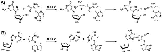 On the other hand, the experiments carried out with the poly(A) electrochemical biosensors showed a different behavior. Since this adenine residue in DNA is oxidized at a higher applied potential than guanine, it is proposed that upon applying the conditioning potential of −0.60 V, AZA molecules were reduced and the radical formed during this reaction was stabilized through the interactions with amino groups of adenine and guanine residues, resulting in the formation of adducts (Scheme 2B). In order to prove this interaction mechanism, MS spectra were recorded, demonstrating the formation of an adduct between purine bases and AZA. In fact, these types of DNA damage by AZA are documented in the literature [38,39], whereby nitropolycyclic aromatic compounds were reduced in situ, reacted with DNA, and subjected to NMR and LC-MS investigations, which demonstrated the formation of adducts with both guanine and adenine residues. Nonetheless, the formation of these types of adducts explains the increase of the DNA oxidation peaks upon interaction with AZA at −0.60 V.