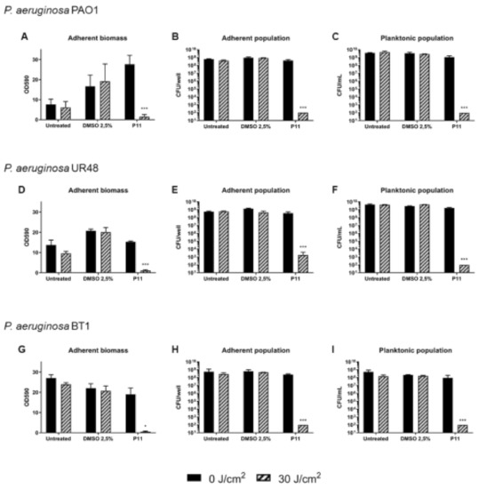- Collins, T.L.; Markus, E.A.; Hassett, D.J.; Robinson, J.B. The Effect of a Cationic Porphyrin on Pseudomonas aeruginosa Biofilms. Curr. Microbiol. 2010, 61, 411–416. [Google Scholar] [CrossRef] [PubMed]