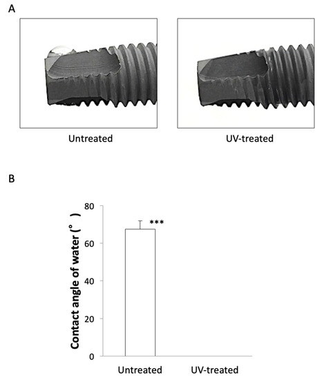 (A) Hydrophilicity of implants. The untreated implant (left) formed a water droplet, whereas the UV-treated implant (right) formed no water droplet, indicating its superhydrophilicity. Water spreads and distributes over the entire implant along its groove. (B) Contact angle between an implant surface and a water droplet. The contact angle on untreated implants was significantly higher than that on UV-treated implants. *** p < 0.001.