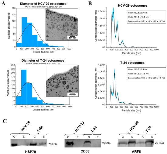 Characterization of ectosome samples isolated from conditioned media of T-24 urothelial bladder carcinoma and HCV-29 normal ureter epithelial cells. (A) Morphological characterization of HCV-29- and T-24-derived ectosomes by transmission electron microscopy (TEM). Size distributions are presented on histograms. Mean diameter ± standard deviation was calculated for all observed vesicles (n) from a given sample. (B) Nanoparticle tracking analysis (NTA) of HCV-29- and T-24-derived ectosomes. Results from five independent measurements for each cell line are presented on graphs. The shaded area depicts standard deviation. (C) Representative Western blot of extracellular vesicle markers in whole-cell protein extracts (lines C) and ectosome samples (lines E). Fifty μg of proteins separated by 10% SDS-PAGE and transferred into PVDF membrane were probed with anti-HSP70 (1:2000), anti-CD63 (1:2000) and anti-ARF6 (1:500) as primary antibodies and anti-mouse IgG-HRP (1:400) as a secondary antibody.