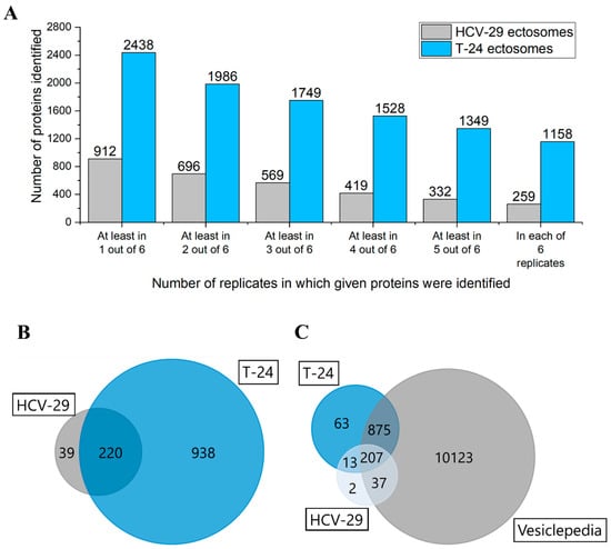 (A) Number of proteins identified in particular numbers of replicates of ectosome samples (the total number of six replicates included two biological replicates with three technical replicates each). (B) Venn diagram illustrating the number of proteins identified in two biological replicates of ectosomes derived from T-24 urothelial bladder carcinoma and HCV-29 normal ureter epithelial cells by at least two peptides. (C) Venn diagram illustrating protein overlap between isolated ectosomes and Vesiclepedia database as a reference.