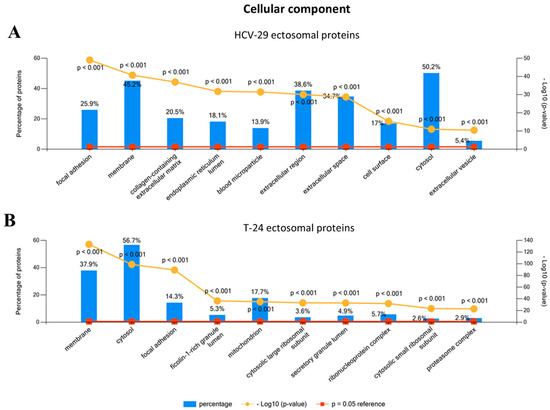 Gene ontology (GO) analysis of proteins identified in ectosomes derived from HCV-29 normal ureter epithelial cells (A) and T-24 urothelial bladder carcinoma cells (B) performed with the use of FunRich 2.0 software with UniProt (release 2020_12) database as a reference. For GO term “Cellular compartment” ten categories with the highest statistical significance of protein enrichment within the specific category (p < 0.001) were presented on graphs. Complete results of GO analysis are provided in Supplementary Data S2.