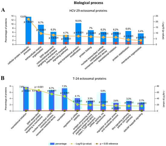 Gene ontology (GO) analysis of proteins identified in ectosomes derived from HCV-29 normal ureter epithelial cells (A) and T-24 urothelial bladder carcinoma cells (B) performed with the use of FunRich 2.0 software with UniProt (release 2020_12) database as a reference. For GO term “Biological process” ten categories with the highest statistical significance of protein enrichment within the specific category (p < 0.001) were presented on graphs. Complete results of GO analysis are provided in Supplementary Data S2.