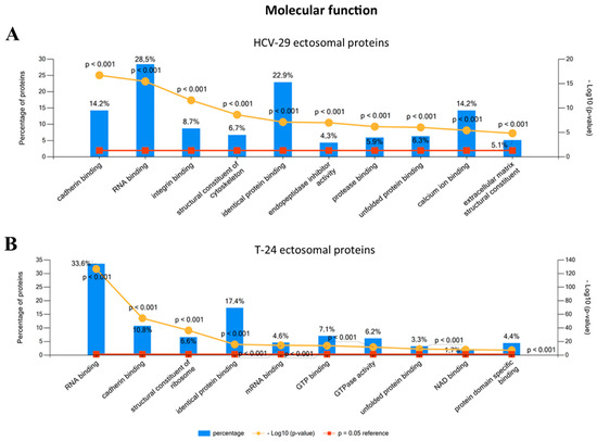 Gene ontology (GO) analysis of proteins identified in ectosomes derived from HCV-29 normal ureter epithelial cells (A) and T-24 urothelial bladder carcinoma cells (B) performed with the use of FunRich 2.0 software with UniProt (release 2020_12) database as a reference. For GO term “Molecular function” ten categories with the highest statistical significance of protein enrichment within the specific category (p < 0.001) were presented on graphs. Complete results of GO analysis are provided in Supplementary Data S2.