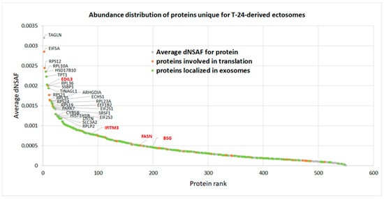 Figure 6 depicts the relative abundance of proteins uniquely identified in T-24-derived ectosomes (i.e., not identified in any replicate of HCV-29-derived ectosomes). In total, 180 out of 549 proteins were assigned by GO to exosomal localization, including EGF-like repeat and discoidin I-like domain-containing protein 3 (EDIL3), interferon-induced transmembrane protein 3 (IFITM3), fatty acid synthase (FASN) or basigin (BSG). Although in the present study ectosomes (not exosomes) were isolated, a variety of proteins can be found in more than one EVs population, thus assignment of the aforementioned proteins to exosomal localization by GO only demonstrates their vesicular origin. Furthermore, many (116) of the proteins unique for T-24-derived ectosomes were assigned by GO to the protein translation process. Ribosomal proteins and translation factors also dominated among the most abundant proteins in T-24-derived ectosomes.