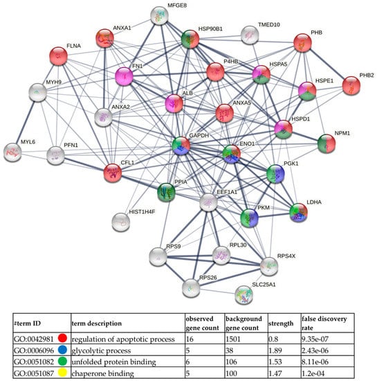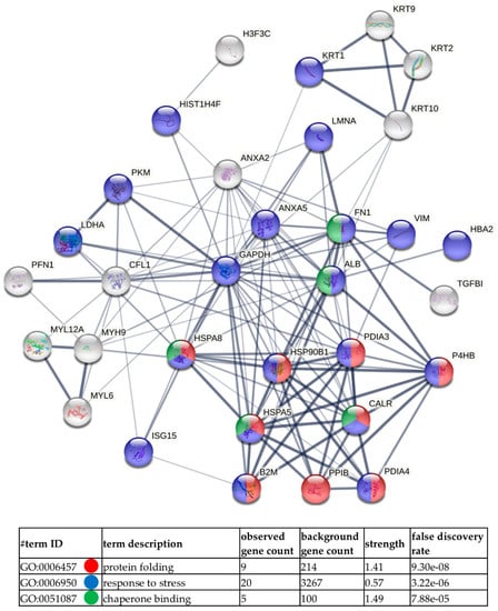 Next, GO analysis and diagrams of functional protein association networks were prepared with the use of STRING v. 11.0 software. For HCV-29-derived ectosomes 10% of the most abundant proteins based on dNSAFs that were identified in five or six replicates were taken into consideration (i.e., 33 proteins). The most strongly represented pathways included protein folding and chaperon binding which relate to another enriched GO category, namely, response to stress (Figure 7). Analogously, 33 of most abundant proteins from T-24-derived ectosomes were analyzed (Figure 8), revealing enrichment in proteins related to unfolded protein binding and chaperon binding. T-24-derived ectosomes were also highly enriched in proteins involved in apoptosis regulation and glycolytic process, which may result from the Warburg effect often observed in cancer cells. Finally, when 10% of the most abundant proteins (135 of 1349) for T-24-derived ectosomes were analyzed (Supplementary Data S3), the most enriched pathways included ribosomal constituents as well as translational and co-translational processes. This suggests the involvement of T-24-derived ectosomal proteins in widely understood protein biosynthesis.