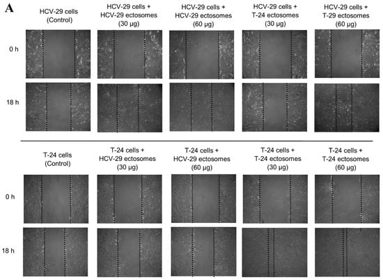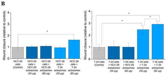 Effect of incubation of T-24 urothelial bladder carcinoma and HCV-29 normal ureter epithelial cells with ectosomes released by these cell lines. Wound healing assay was performed after 18 h of incubation with ectosomes. (A) Representative images were taken at 0 h and at 18 h. (B) Graphs presenting the relative rate of wound closure calculated from three repetitions. “*” denotes statistically significant differences (Tukey’s post-hoc test, p-value < 0.05).