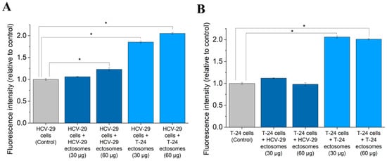 HCV-29 and T-24 cells were seeded onto 96-well plates at the density of 1 × 104 cells/100 µL. The next day, a serum-free medium was added and cells were incubated with two doses of ectosomes (30 µg and 60 µg of proteins). After 18 h of incubation, 10% of Alamar Blue reagent was added to each well and after 2 h fluorescence intensity was measured at 560/595 nm. Results were standardized in relation to the untreated control (taken as 1).