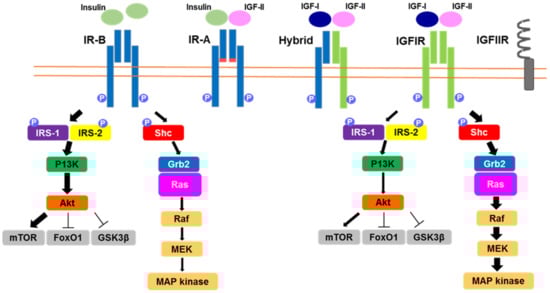 IGF-IR and IR are activated and auto-phosphorylated, followed by the binding of their ligands to the receptor. Subsequently, insulin receptor substrate (IRS)-1 and IRS-2 bind to the activated IGF-IR and IR through its phosphotyrosine binding (PTB) domain []. The activated IGF-IR or IR phosphorylates specific substrates, such as IRS-1, IRS-2, and Shc. The phosphorylated tyrosine residues of IRS-1, IRS-2, and Shc are recognized by various signaling molecules that contain an Src homology 2 (SH2) domain, including Grb2 and the 85 kDa regulatory subunit of phosphatidylinositol 3-kinase (PI3-kinase), leading to the activation of multiple downstream cascades (Figure 1). Grb2 is involved in the activation of a Ras-MAPK pathway. PI3-kinase, which consists of a regulatory subunit responsible for binding to IRSs and a catalytic subunit responsible for the phosphorylation of phosphatidylinositols, is a lipid kinase and a key element in the pathway leading to the metabolic effects of insulin. Thus, IGF-I has also been suggested to mediate insulin-like bioactivities.