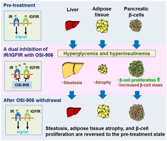 The effect of administration and withdrawal of OSI-906 on metabolic organs. The daily administration of OSI-906, a dual inhibitor of IGF-I receptor (IGF-IR) and insulin receptor (IR), to mice for a week provokes hepatic steatosis, induces lipoatrophy, and increases β-cell proliferation accompanied by hyperglycemia and hyperinsulinemia. The withdrawal of OSI-906 reverse hepatic steatosis, lipoatrophy, and β-cell proliferation, although the increased β-cell mass remained.