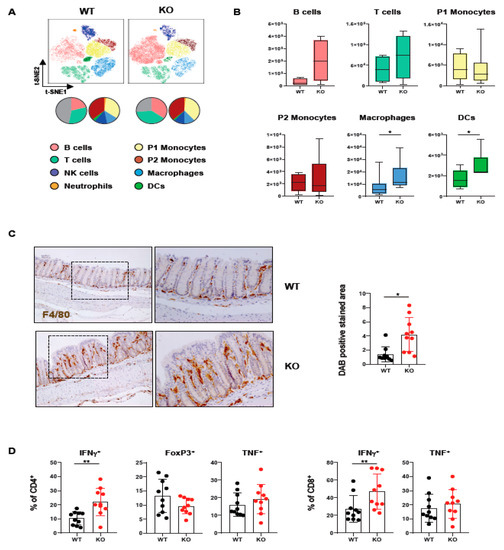 Loss of PTPN2 in DCs affects immune cell populations in the lamina propria. Immune cells were analyzed in PTPN2fl/fl (WT) and PTPN2fl/flxCD11cCre (KO) mice: (A,B) t-SNE maps displaying live, CD45+ singlet cells in lamina propria lymphocytes (LPL). Colors correspond to FlowSOM-guided clustering of cell populations. Pie charts represent relative numbers among CD45+ cells; (A) t-SNE maps of CD45+ cells in LPL; (B) total counts of indicated cell populations in LPL; (C) IHC staining for F4/80+ macrophages in colon; (D) relative numbers of Tregs, IFNγ- or TNF-producing CD4+ and CD8+ T cells. * p < 0.05, ** p < 0.01; unpaired Mann–Whitney test, n = 5–7 per group.