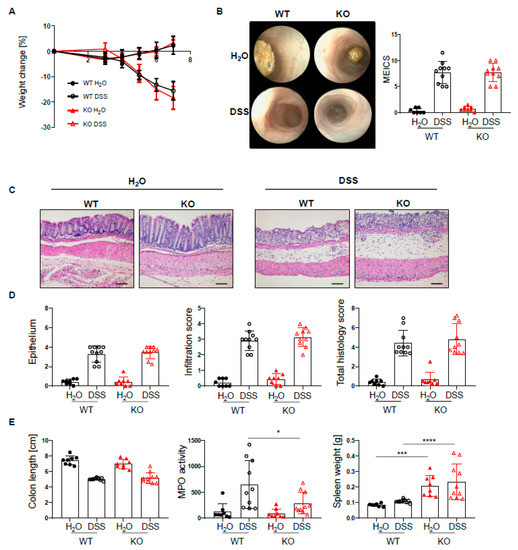 PTPN2 deficiency in DCs does not aggravate inflammation in acute DSS colitis. PTPN2fl/fl (WT) and PTPN2fl/flxCD11cCre (KO) mice received 2.5% DSS for 7 days: (A) relative weight changes; (B) representative pictures from colonoscopy and murine endoscopic index of colitis severity (MEICS); (C,D) representative pictures from H&E staining of the terminal colon and histological scoring; (E) colon length, MPO activity, and spleen weight. Scale bars represent a length of 100 mm. * p < 0.05, *** p < 0.001, **** p < 0.0001; unpaired Mann–Whitney test. Data are representative for one out of two independent experiments with 4–5 mice per experimental group.