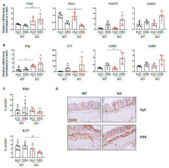 Increased Th1 response in PTPN2fl/flxCD11cCre mice in acute colitis. RNA was isolated from whole colon pieces of PTPN2fl/fl (WT) and PTPN2fl/flxCD11cCre (KO) mice: (A,B) mRNA expression of the indicated; (A) Th-cell-associated transcription factors; (B) cytokines and activation markers in whole colon lysates; (C) frequencies of IFNγ+ and IL17+ CD4+ T cells in lamina propria; (D) IHC staining for F4/80+ macrophages in the colon. * p < 0.05, ** p < 0.01; unpaired Mann–Whitney test. Data are representative for one out of two independent experiments with 4–5 mice per experimental group.