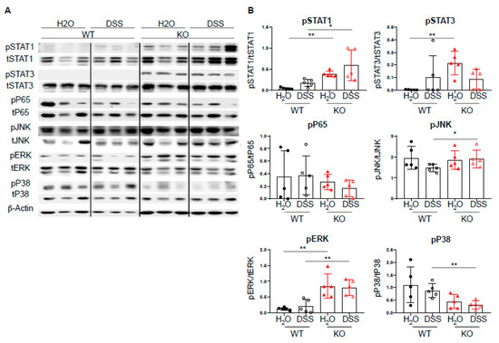 Given the increased expression of Th1-associated transcription factors, we next investigated the effect of DC-specific PTPN2 on well-described PTPN2 targets, such as STAT molecules, MAPK, JNK, and ERK [6,9,10,11]. Upon acute DSS-induced colitis, we observed increased levels of pSTAT1 in PTPN2fl/flxCD11cCre mice upon DSS treatment, whereas pP65 and pJNK levels were not affected. PTPN2-deficient mice displayed increased levels of pERK and decreased levels of pP38, respectively. Further, we detected elevated levels of pSTAT3 in untreated PTPN2fl/flxCD11cCre mice but upon DSS treatment, this difference was no longer present (Figure 4A,B). Taken together, despite the well-described action of PTPN2 on multiple signaling cascades, loss of DC-specific PTPN2 resulted in increased levels of STAT1 phosphorylation in acute DSS-induced colitis but had no drastic changes in the overall inflammatory response.