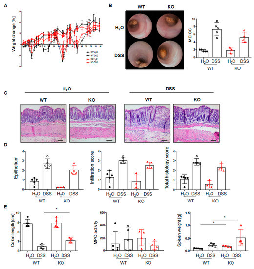 PTPN2fl/flxCD11cCre mice tend to develop a less pronounced chronic inflammation. PTPN2fl/fl (WT) and PTPN2fl/flxCD11cCre (KO) mice received 4 cycles of DSS (7 days of 1.5% DSS followed by 10 days with normal drinking water) and were analyzed 4 weeks after the last DSS administration: (A) relative weight changes; (B) representative pictures from colonoscopy and assessment of murine endoscopic index of colitis severity (MEICS); (C,D) representative pictures from H&E staining of the terminal colon and histological scoring; (E) colon length, spleen weight, and MPO activity. Scale bars represent a length of 100 mm. * p < 0.05; unpaired Mann–Whitney test. Data are representative for one out of two independent experiments with 5 mice per experimental group.
