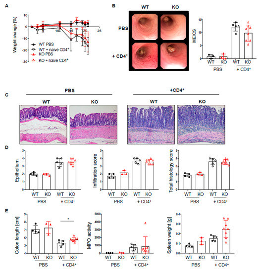Loss of PTPN2 in DCs does not aggravate colitis severity in a T cell transfer colitis model. PTPN2fl/flxRAG−/− (WT) and PTPN2fl/flxCD11cCrexRAG−/− (KO) mice were injected i.p. with PBS or 2.5 × 105 naive CD4+ T cells: (A) weight development post injection; (B) representative pictures from colonoscopy and assessment of colitis severity according to the murine endoscopic index of colitis severity (MEICS); (C,D) representative pictures from H&E staining of the terminal colon and histological scoring; (E) colon length, spleen weight, and MPO activity. Scale bars represent a length of 100 mm. * p < 0.05; unpaired Mann–Whitney test. Data are representative for one out of two independent experiments with 3–5 mice per experimental group.