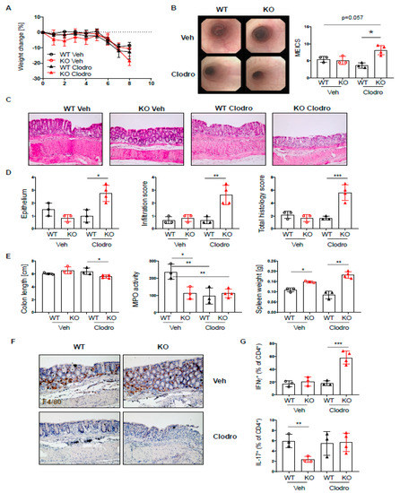 Macrophages protect PTPN2fl/flxCD11cCre mice from elevated colitis. PTPN2fl/fl (WT) and PTPN2fl/flxCD11cCre (KO) mice received 2.5% DSS for 7 days and were treated with vehicle liposomes or clodronate liposomes on day-1, day 2, and day 4 to deplete macrophages: (A) weight development post injection; (B) representative pictures from colonoscopy and assessment of colitis severity according to the murine endoscopic index of colitis severity (MEICS); (C,D) representative pictures from H&E staining of the terminal colon and histological scoring; (E) colon length, MPO activity, and spleen weight; (F) IHC staining for F4/80+ macrophages in the colon; (G) frequencies of IFNγ+ and IL17+ CD4+ T cells in the lamina propria. * p < 0.05, ** p < 0.01, *** p < 0.001; unpaired Mann–Whitney test. Data are representative for one out of two independent experiments with 3–4 mice per experimental group.