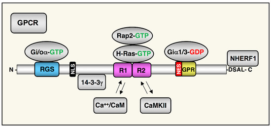 While many RGS proteins are dedicated GAPs for target G proteins, some are more complex multifunctional proteins. One such complex RGS protein is RGS14, a ~62 kDa multi-domain scaffolding protein that is a member of the D/R12 subfamily of RGS proteins [7,8]. RGS14 serves as a GAP for Gi/o family members and can regulate their coupling to certain GPCRs [9,10,11,12], while both GPCRs and the non-receptor guanine exchange factor (GEF) resistance to cholinesterase inhibitor 8A (Ric8A) regulates RGS14–Gα–GTP complexes [12,13,14,15]. Besides acting as a GAP for certain Gα subunits, RGS14 also integrates G protein, mitogen activated protein kinase/extracellular regulated kinase (MAPK/ERK), and calcium signaling pathways in host cells. The RGS14 domain structure includes a conserved RGS domain that binds active Gαi/o–GTP [16], a tandem Ras/Rap (R1/R2)-binding domain (RBD) that binds activated H-Ras–GTP, Rap2–GTP and Raf kinases [9,16], and a GoLoco/G protein regulatory (GPR) domain that binds inactive Gαi1/3-GDP [17] (Figure 1). Additionally, RGS14 binds calcium/calmodulin (Ca2+/CaM) and Ca2+/CaM-dependent kinase II (CaMKII) within the R1/2 RBD [17] and binds the 14-3-3γ scaffolding protein in the linker region between the RGS and R1/2 RBD [18]. Unlike most scaffolding signaling proteins, RGS14 is also a nuclear–cytoplasmic shuttling protein that contains a nuclear export sequence (NES) embedded within the GPR motif and a nuclear localization sequence (NLS) located between the RGS and R1 domains [19,20,21]. The multitude of binding partners confer to RGS14 a capacity to regulate many key signaling pathways and cellular processes, and, in turn, for its actions and subcellular localization to be regulated. In this review, we will discuss the current state of the knowledge about RGS14 signaling function in the brain, in particular, as it relates to its role in post synaptic signaling, plasticity, and animal behavior.