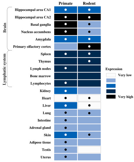 Reported tissue expression of RGS14 in adult primate and rodent. Cell shading indicates RGS14 mRNA expression across tissues. Dot indicates positive RGS14 protein expression data. Data were aggregated from the following sources: ProteomicsDB [49], Mouse Gene Expression Database (GXD) [50], Global Proteome Machine Database (GPMDB) [51], Allen Human Brain Atlas [52], Allen Mouse Brain Atlas [53], Human Protein Atlas [54], Ensembl [55], Evans et al. 2014 [27], Squires et al. 2018 [26], and Foster et al. 2021 [56]. Expression levels for mRNA were compiled from the sources cited above and defined in a relative manner from available data for each species (M. musculus and R. norvegicus for rodent, H. sapiens and M. mulatta for primate).