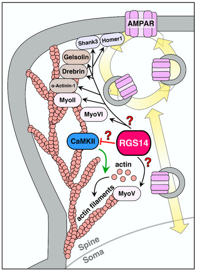 Recent proteomic studies identified RGS14 binding interactions in the mouse brain [17]. The findings reported that RGS14, when recovered by immuno-affinity capture out of whole-brain lysates, exists in a very high molecular weight complex, suggesting that endogenous RGS14 exists as part of a larger protein complex. Recovered proteins were subjected to mass spectrometry and proteomic analysis, revealing a network of 233 proteins that were significantly enriched in complex with RGS14. Within this RGS14 interactome, the most highly enriched interactors are postsynaptic proteins involved in AMPA receptor trafficking (myosins IIb, V, and VI) [105], actin-binding proteins that maintain the dendritic cytoskeleton (e.g., drebrin, gelsolin, alpha actinin 1) [106], postsynaptic density (PSD) proteins that scaffold AMPA/NMDA receptors to key signaling molecules (Homer1, Shank3) [107], and kinases/phosphatases that transduce signals in dendritic spines (CaM, CaMKII, and protein phosphatase 1) [108]. Obviously, RGS14 does not bind all of these proteins, but likely acts on a few common proteins key to postsynaptic signaling events that support spine plasticity (Figure 4).