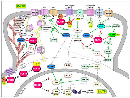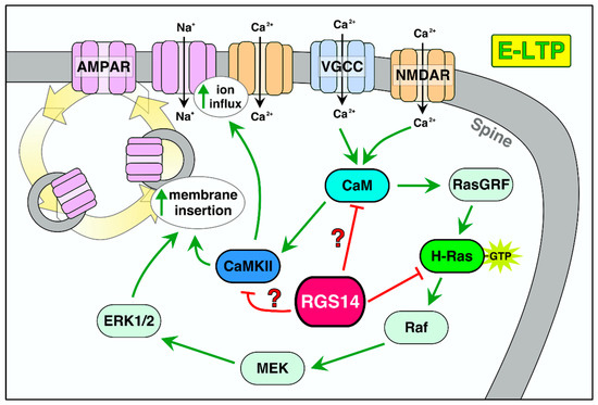 The active translocation of CaMKII to synapses is necessary and sufficient for E-LTP by phosphorylating a host of downstream targets [91,125,128]. Of note, RGS14 binds Ca2+/CaM and CaMKII and is phosphorylated by CaMKII [17]. Phosphorylation of NMDARs by CaMKII enhances single-channel conductance and is necessary for LTP [129], and the phosphorylation of AMPARs and transmembrane AMPAR-regulatory proteins (TARPs) by CaMKII causes lateral diffusion, insertion, and stabilization of AMPARs into PSD slots to increase postsynaptic potentiation [130,131]. Endosomes containing AMPARs are exocytosed by the actions of many different proteins, including myosins [110,132], thereby increasing the rate of AMPAR exocytosis vs. endocytosis and increasing postsynaptic potentiation. RGS14 engages myosins in the brain as part of a high molecular weight complex [17]. CaMKII also phosphorylates and activates a set of GEFs and GAPs for monomeric regulatory GTPases, which cause actin polymerization and spine remodeling to produce what is known as structural plasticity [133]. RGS14 directly binds activated H-Ras and Rap2A, which are likely to modulate these events [9,14,15,16,18,102,104]. Although both functional and structural plasticity during E-LTP are critical for memory formation, AMPAR-mediated EPSCs are necessary for E-LTP, while spine remodeling is not and is mechanistically distinct from the E-LTP mechanisms [134].