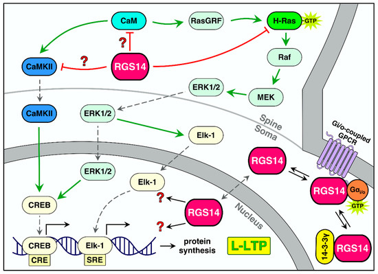 Besides binding Gαi/o proteins, RGS14 also binds other signaling proteins, including 14-3-3 [18]. The 14-3-3 family is a group of scaffolding proteins that can alter the conformation, activity, and availability of binding sites, and the localization of their interacting partners [93]. Recently, our lab and others have reported that RGS14 is a nuclear–cytoplasmic shuttling protein, and have made efforts to determine what regulates RGS14 localization in subcellular compartments [20,21,98]. In the hippocampus, 14-3-3 proteins are essential for LTP in CA1, and the inhibition of 14-3-3 impairs associative learning and memory [101]. RGS14 binds 14-3-3γ in hippocampal neurons in a phosphorylation-dependent manner at Ser218, which is located in the linker region between the RGS and R1 RBD domains. Of interest, 14-3-3 also binds RGS14 in a phosphorylation-independent manner at a distinct unknown site [18]. Phosphorylation-dependent interactions are enhanced by H-Ras activation, which results in the phosphorylation of Ser218, suggesting kinase activity downstream from H-Ras converges on RGS14 to enhance RGS14–14-3-3γ binding. However, H-Ras-dependent enhancement of RGS14–14-3-3γ binding occurs 2 h after H-Ras activation, which may reflect that RGS14 phosphorylation and the subsequent enhanced binding to 14-3-3γ first requires transcription and translation [18]. Functionally, phosphorylation-dependent 14-3-3γ binding to RGS14 inhibits RGS14 GAP activity towards GTP-bound Gαi, without affecting other RGS14 interactions. Importantly, the phosphorylation-independent 14-3-3γ interaction prevents RGS14 nuclear import. Clearly, 14-3-3γ is a key regulator of RGS14 subcellular localization and actions in hippocampal neurons important for synaptic plasticity.