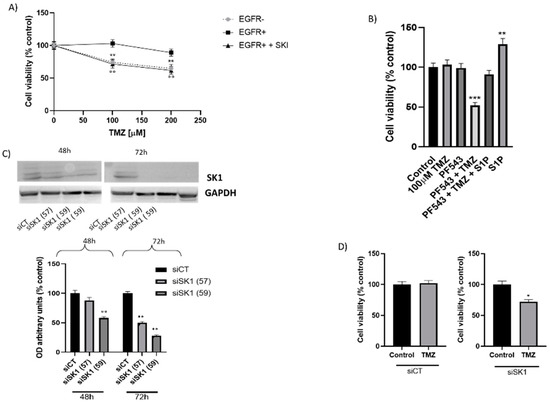 First, we evaluated the effect of the inhibition of SKs on TMZ-induced cytotoxicity by administering the drug together with a pan-SK inhibitor (SKI). We found that the co-treatment with TMZ and SKI (both at sub-toxic concentrations) significantly reduced EGFR+ cell viability (Figure 1A). In particular, in EGFR+ cells treated with 100 or 200 µM TMZ in the presence of a subtoxic dose of SKI, cell viability was decreased by 29% and 38%, respectively, compared to cells treated with TMZ alone (Figure 1A), obtaining a behavior very similar to the one we obtained with EGFR- cells treated with TMZ (Figure 1A). Of note, when a subtoxic dose of SK1 selective inhibitor PF543 was used, 100 µM TMZ significantly decreased (by 48%) EGFR+ cell survival (Figure 1B). Subsequently, in order to assess whether S1P is directly involved in EGFR+ acquired TMZ resistance, we evaluated the effect of nanomolar concentrations of S1P on cell survival in the presence of TMZ and PF543, separately or in combination. As shown in Figure 1B, in EGFR+ cells, the administration of nanomolar concentrations of S1P to control and TMZ-treated cells significantly increased the number of viable cells, supporting a growth- and survival-promoting effect of S1P (Figure 1B). Finally, and remarkably, the treatment with exogenous S1P resulted in the efficient reversion of the sensitizing PF543 effect on TMZ toxicity, determining a significant increase in viable cells (Figure 1B).
