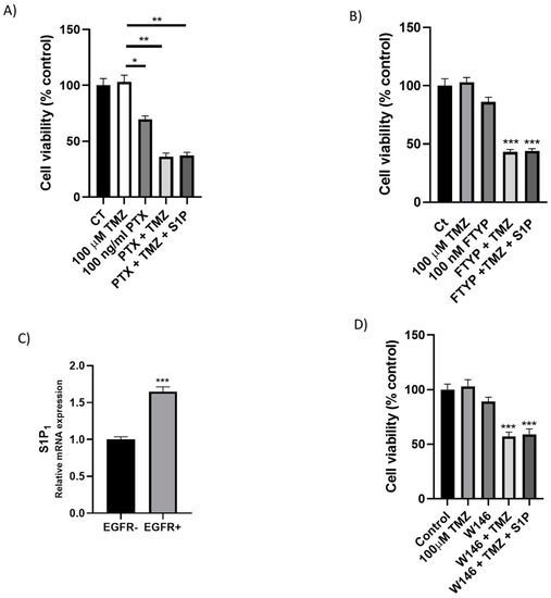 Extracellular S1P promotes EGFR+ cell resistance to temozolomide. EGFR+ cells were seeded at 30,000 cells/cm2 exposed to 100 µM TMZ alone or in combination with (A) 100 ng/mL PTX, (B) 100 nM FTY720. Cell viability was assessed by MTT assay after 24 h of treatment. Results are expressed as percentage of cell survival with respect to vehicle-treated cells. Data are mean ± SD of three independent experiments. (C) Cells were seeded and harvested as described in Materials and Methods. S1P1 mRNA expression by real-time PCR in EGFR- and EGFR+ cells. mRNA expression was normalized to the level of the housekeeping gene β-actin and referred to that of EGFR- cells. Data are shown as mean ± SD of independent experiments (n = 3). *** p < 0.001 versus control (t-test) (D) EGFR+ cells were seeded at 30,000 cells/cm2 exposed to 100 µM TMZ alone or in combination with 10 µM W146 with or without 100 nM S1P. Cell viability was assessed by MTT assay after 24 h of treatment. Results are expressed as percentage of cell survival with respect to vehicle-treated cells. Data are mean ± SD of three independent experiments. * p < 0.05, ** p < 0.01, *** p < 0.001 versus 100 µM TMZ (one-way ANOVA followed by Tukey’s post hoc test).