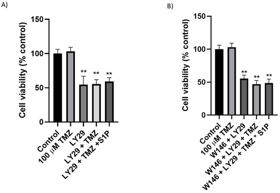 Role of AKT on S1P-mediated survival of EGFR+ cells. EGFR+ cells were seeded at 30,000 cells/cm2 exposed to 100 µM TMZ alone or in combination with (A) 20 µM LY294002, (B) 20 µM LY294002 together with 10 µM W146 with or without 100 nM S1P. Cell viability was assessed by MTT assay after 24 h of treatment. Results are expressed as percentage of cell survival with respect to vehicle-treated cells. Data are mean ± SD of three independent experiments. ** p < 0.01 versus control (one-way ANOVA followed by Tukey’s post hoc test).