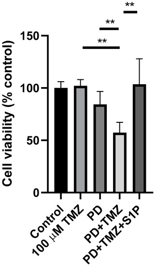 Role of ERK on S1P-mediated survival of EGFR+ cells. EGFR+ cells were seeded at 30,000 cells/cm2 exposed to 100 µM TMZ alone or in combination with 10 µM PD98059, with or without 100 nM S1P. Cell viability was assessed by MTT assay after 24 h of treatment. Results are expressed as percentage of cell survival with respect to vehicle-treated cells. Data are mean ± SD of three independent experiments. ** p < 0.01 (one-way ANOVA followed by Tukey’s post hoc test).