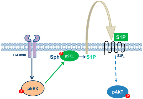 Scheme of the network of EGF-EGFR-SK1-S1P in human glioblastoma cells. In EGFR+ cells, phosphorylation of both ERK1/2 and AKT is significantly higher than in EGFR- cells. Moreover, in EGFR+ cells, pSK1, the activated form of SK1 is higher than in EGFR- cells, and it is dependent on ERK1/2 activation. SK1 activation leads to an increase in the extracellular S1P, which, in turn, binds to S1P1 receptors, thus promoting cell survival via AKT phosphorylation [31].