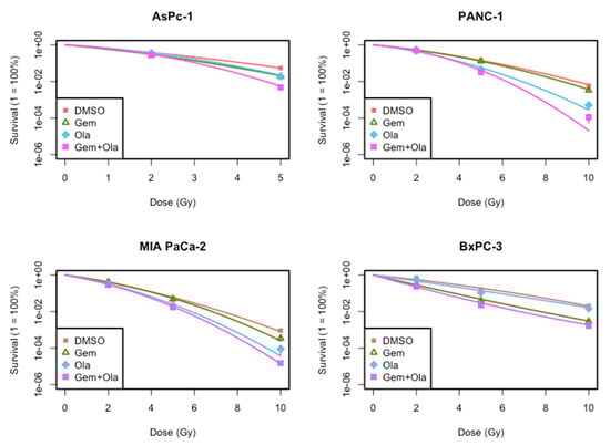 2.3. Radiosensitization of Gemcitabine and/or Olaparib on PDAC Cell Lines