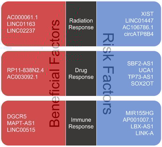 lncRNAs can regulate sensitivity or resistance to different types of anticancer therapies, including radiotherapy, chemotherapy and immunotherapy. lncRNAs associated with increasing therapeutic sensitivity act as beneficial factors and must be upregulated to improve efficacy of glioma treatments. On the other hand, lncRNAs associated with increasing therapeutic resistance act as risk factors and must be downregulated.