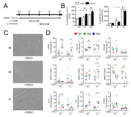 In vitro model of Transforming Growth Factor β1 (TGFβ1)-stimulated fibroblasts. (A) Experimental scheme. Dermal fibroblasts from healthy donors (H-Fb) were starved in a DMEM medium containing 1% FCS (day-2) for 24 h before stimulation with TGFβ1 for 24 h. On day 0, treatment was applied for 24 h and samples were analyzed (day 1 or 2). (B) The proliferation of H-Fb or TGFβ1-stimulated fibroblasts (Tβ-Fb; left panel) normalized on day-1 (n = 12). Apoptosis normalized on CTG assay (right panel). (C) Representative pictures of H-Fb (−TGFβ1) on day 0 or Tβ-Fb (+TGFβ1) on days 0 and 1 after stimulation (×40 objective). (D) Fold change of gene expression normalized on day-1 (n = 6). *: p < 0.05 versus H-Fb on day 0 or $: p < 0.05 versus the indicated group.